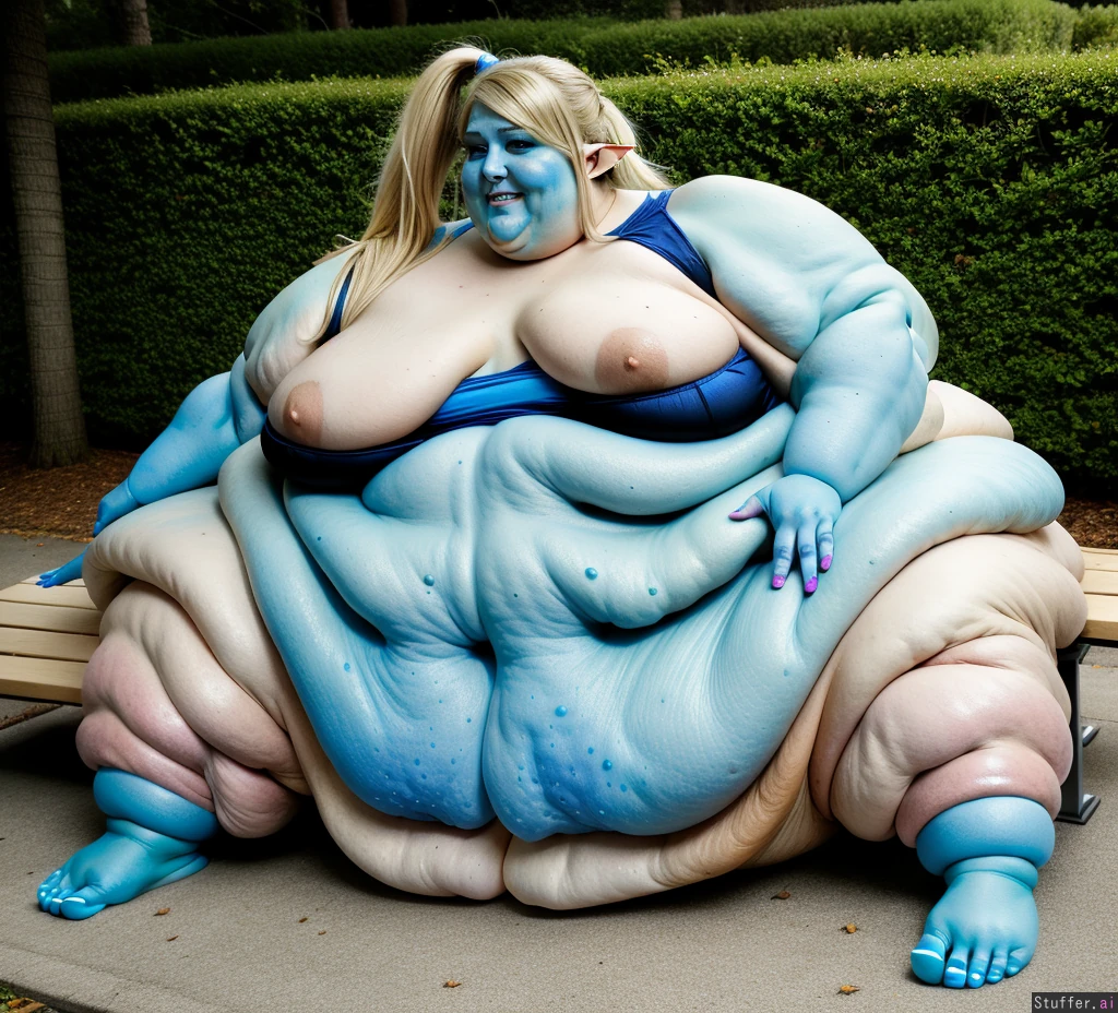 ((((morbidly obese:1.3)))) ((((immobile blubber blob:1.3)))) ((blue colored skin:1.3)) blonde, ponytail, elf, bench, teeth happy face ((feet) ((kissing samus)