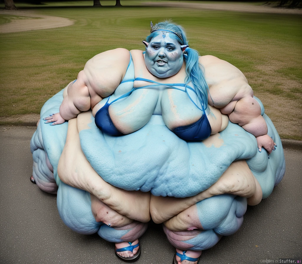 (rebel wilson) ((((morbidly obese:1.5)))) ((((immobile:1.5)))) ((blue colored skin:1.5)) feet elf ponytail (((super-gigantic, mega-enormous breasts, tits, boobs, under-boobs, side-boobs;2.0))) (sandals) nipples ((fat face:2.0)) tiara