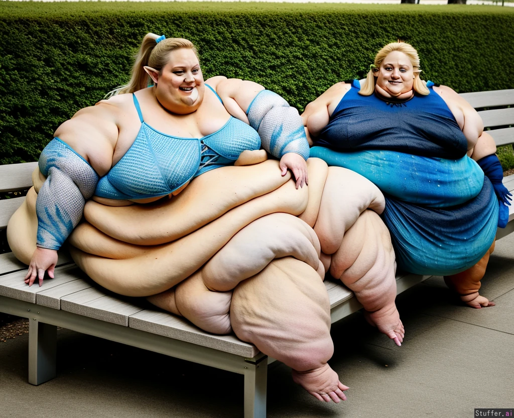 ((((morbidly obese:1.0)))) ((((immobile blubber blob:1.0)))) ((blue colored skin:1.3)) blonde, ponytail, elf, bench, teeth happy face ((feet) ((double chin:2.0)) (rebel wilson)