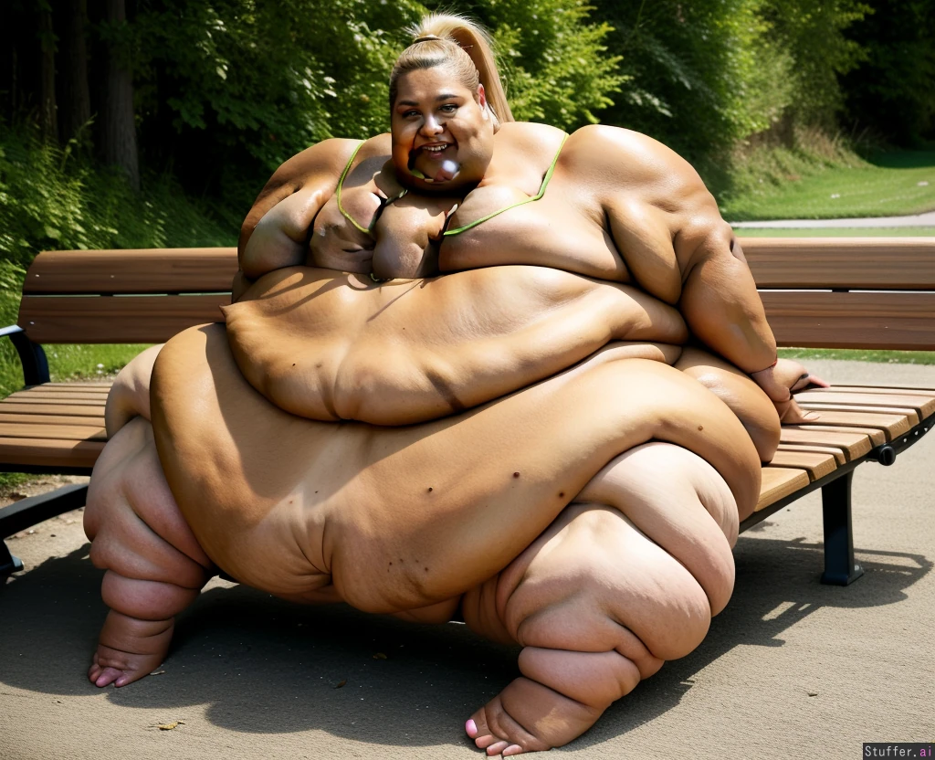 ((((immobile blubber blob:1.0)))) ((dark tanned skin:1.3)) blonde, ponytail, bench, teeth happy face ((feet) ((double chins:2.0)) (rebel wilson)