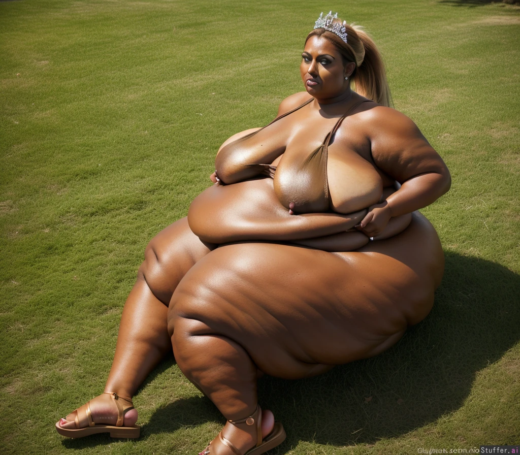 (rebel wilson) ((dark tanned skin:1.5)) feet ponytail (((super-gigantic, mega-enormous breasts, tits, boobs, under-boobs, side-boobs;2.0))) (sandals) nipples tiara (((immobile blubber blob:1.0)))