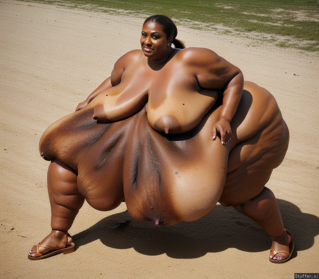 (rebel wilson) ((dark tanned skin:1.5)) feet ponytail (((hyper-huge, super-gigantic, mega-enormous breasts, tits, boobs, under-boobs, side-boobs;2.0))) (sandals) nipples ((mega-blob:1.5))