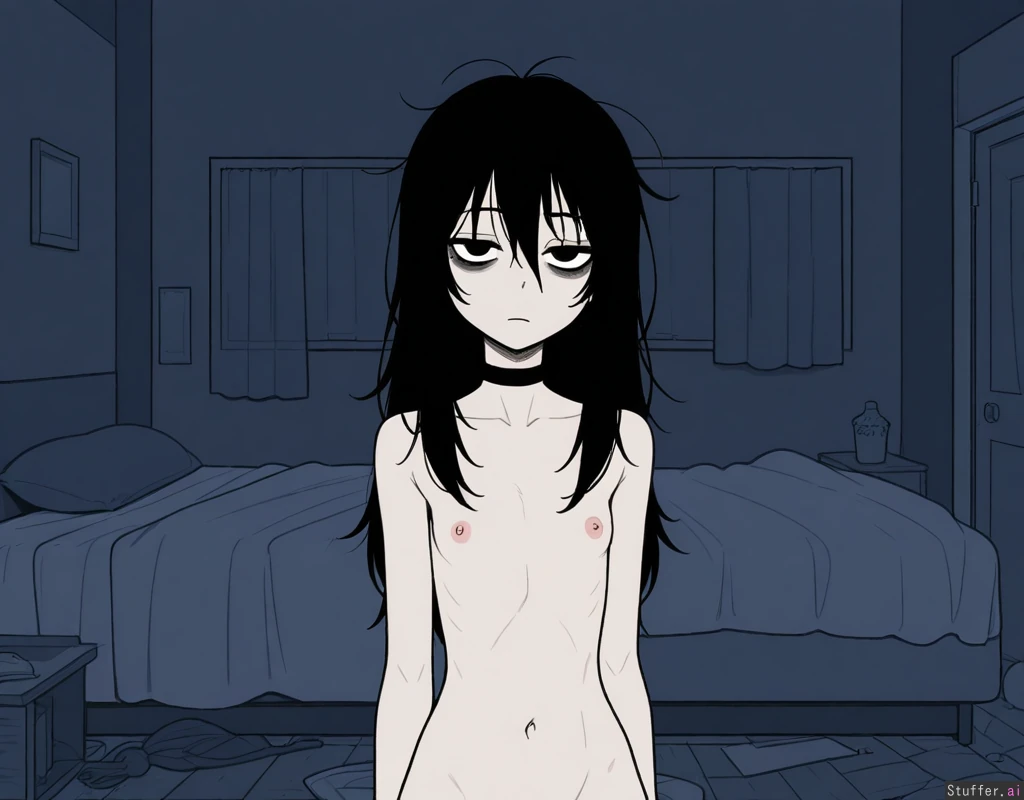 (simple style), (less detail), flat colors, color, bedroom, messy room, long eyelashes, extreme proportions, naked, munchies, night , half lidded eyes, black eyeshadow, black hair , thin upper body, thin torso, long hair , potbelly, wide_hips, bubble_butt , shortstack , bags_under_eyes , messy_hair , three-quarter_portrait , ((thin upper body)) , pale_skin , black_choker , ((white_ankle_socks)) , thin_legs , thin_thighs , skinny , full_body , hyper_ass , hyper_belly ,