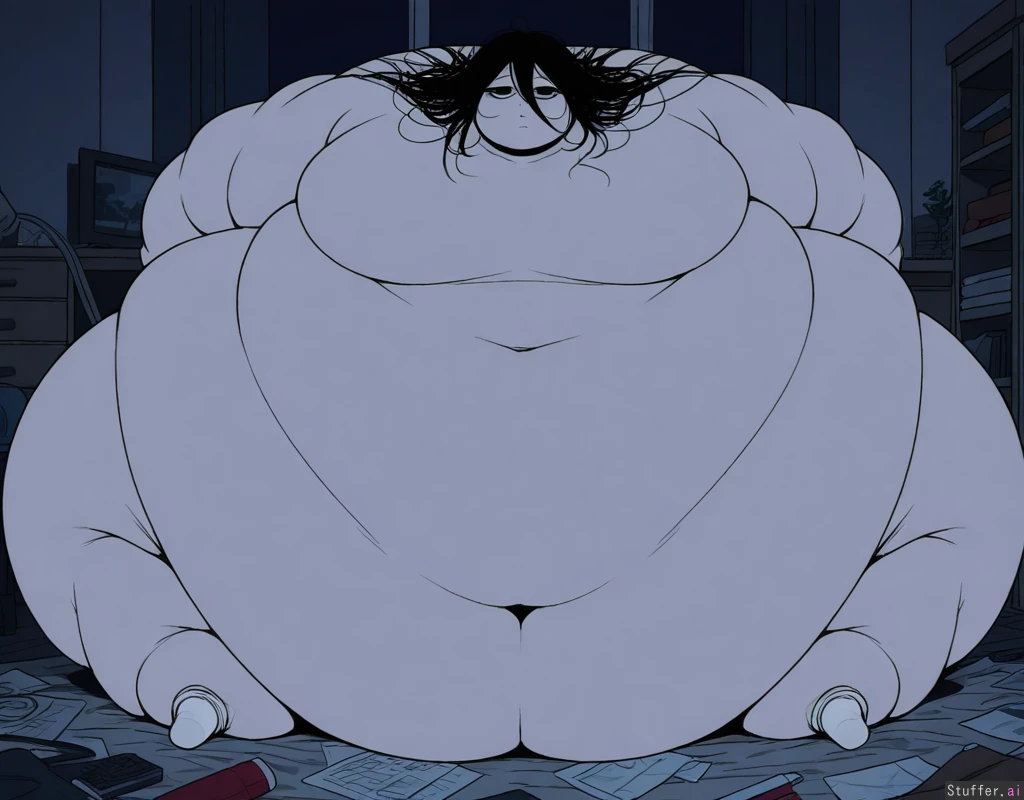 (simple style), (less detail), flat colors, color, bedroom, messy room, long eyelashes, extreme proportions, naked, munchies, night , half lidded eyes, black eyeshadow, black hair , long hair , bags_under_eyes , neet , messy_hair , ((pale_skin)) , black_choker , ((white_ankle_socks)) , full_body , (morbidly obese:2) , immobile , emotionless, hyper_fat , fat_mons ,
