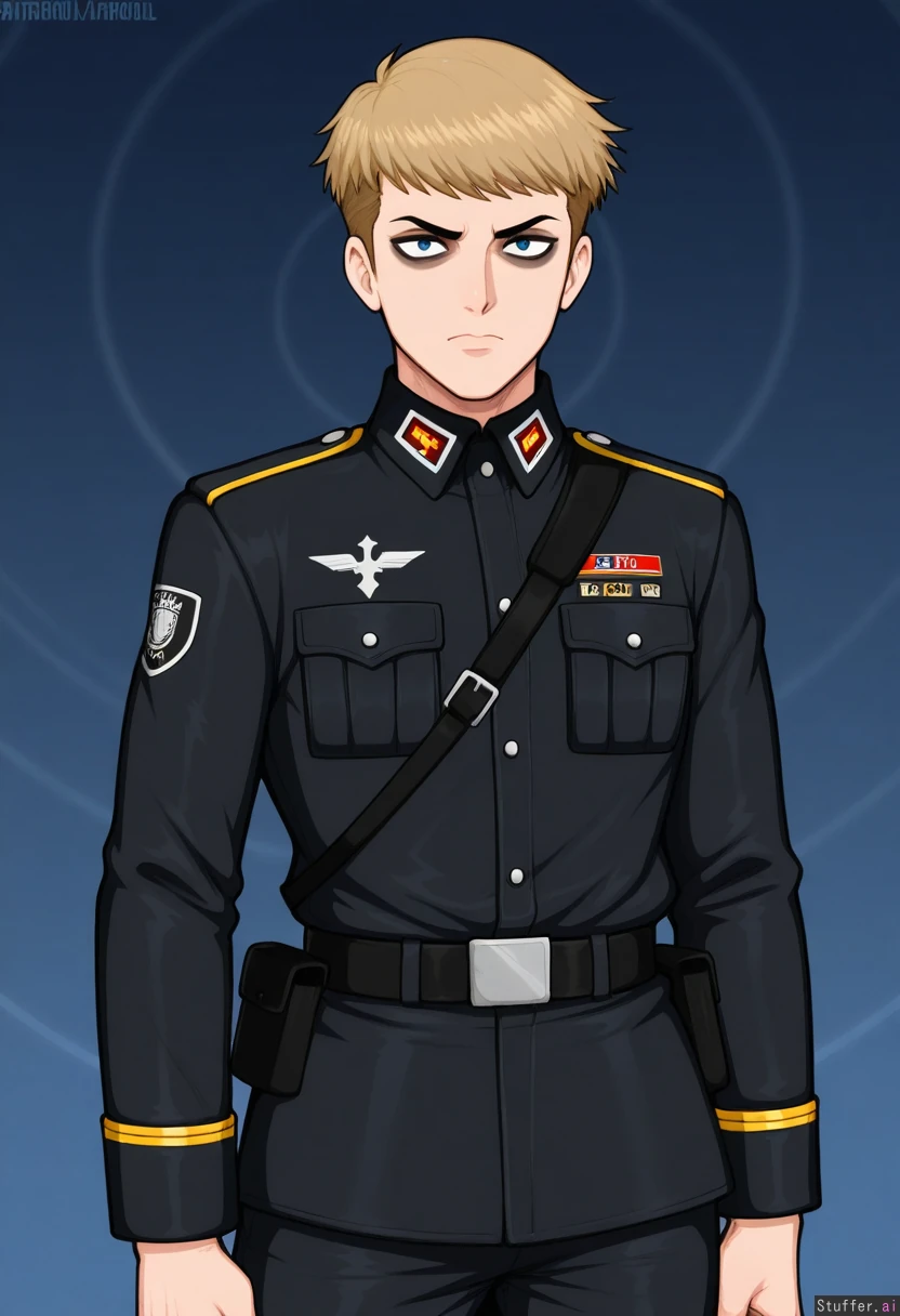 Afrobull, solo, Male, light_brown_hair, blue_ice_eyes, fascist_uniform, black_uniform, black_german_uniform, fascist, strong_face, strong_jawline, autoritarian_stare, masculine_face, 20s, first_plan_shot, circles_under_eyes, middle_part_haircut
