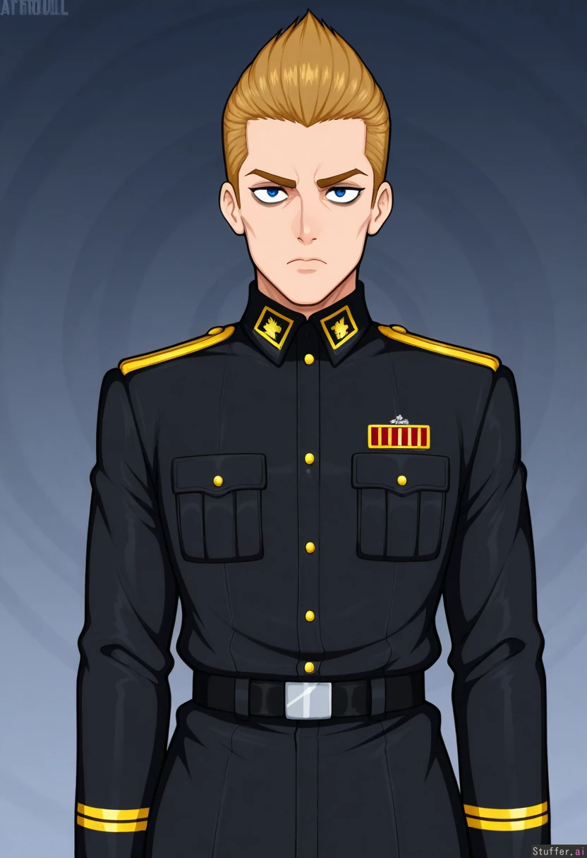 Afrobull, solo, Male, light_brown_hair, blue_eyes, fascist_uniform, black_uniform, black_german_uniform, strong_face, strong_jawline, autoritarian_stare, masculine_face, 20s, first_plan_shot, circles_under_eyes, quiff_cut