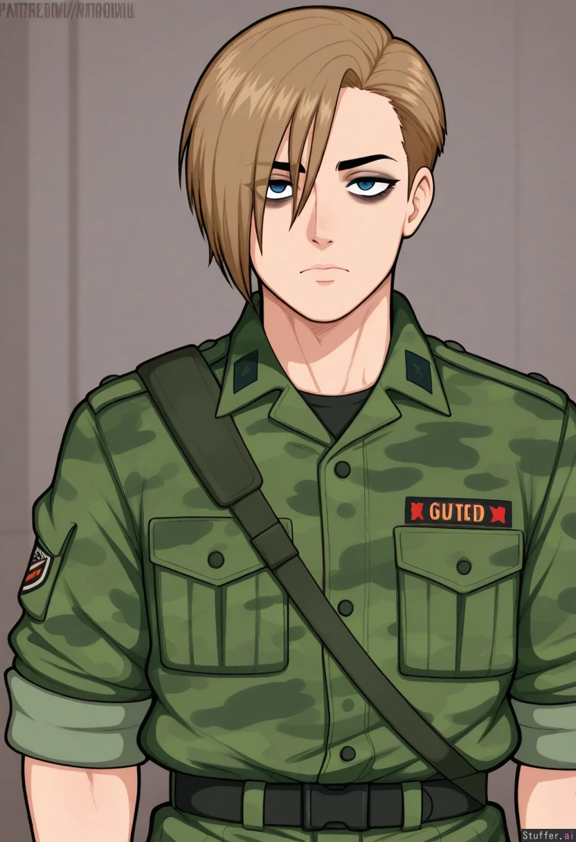 Afrobull, solo, Male, light_brown_hair, blue_eyes, camo_army_general_uniform, strong_face, strong_jawline, autoritarian_stare, masculine_face, 20s, first_plan_shot, circles_under_eyes, side_part_haircut
