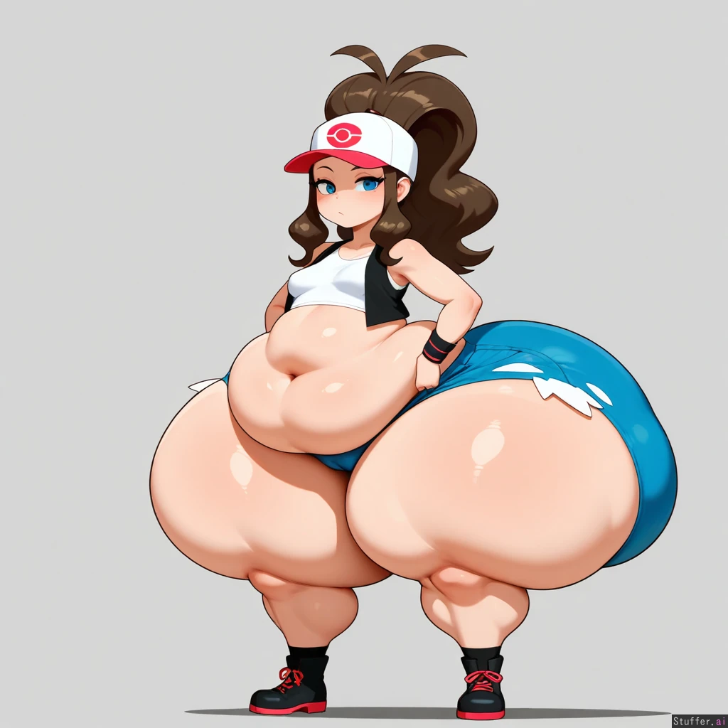 betterwithsalt, (Beautiful Face), (Half Open eyes), (Beautiful eyes), (Seductive), (small breasts), (thin upper body), (extremely_toned_body:1.2),(gigantic_fat_thighs:1.4), (big_fat_ass:1.4), (enormous wide hips:1.4), (gigantic_fat_thighs), (hyper ass), hilda_(pokemon) , three-quarter_portrait , full-length_portrait , fully_clothed , flat_belly , thin_waist , hyper_hips , cameltoe , wide_stance , wide_ass , wide_hips , thick ankles , bottomheavy ,