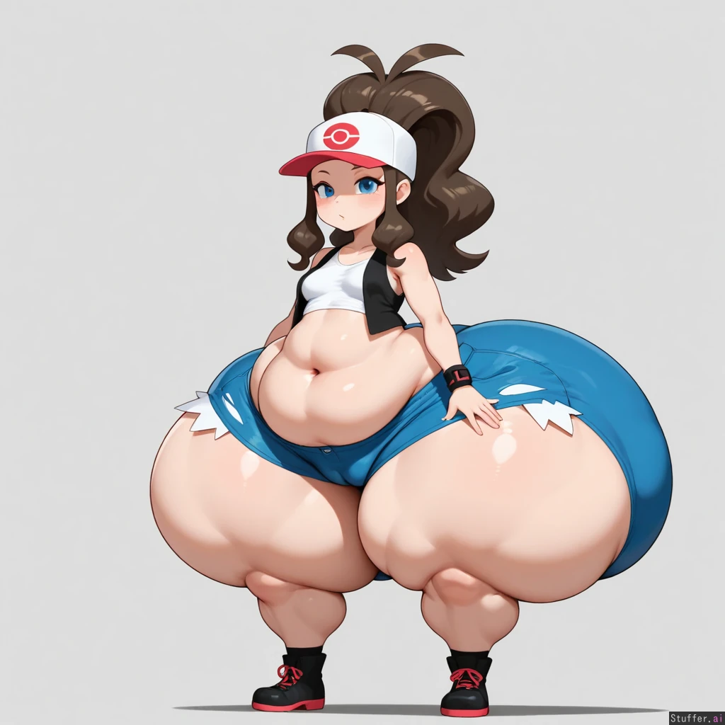 betterwithsalt, (Beautiful Face), (Half Open eyes), (Beautiful eyes), (Seductive), (small breasts), (thin upper body), (extremely_toned_body:1.2),(gigantic_fat_thighs:1.4), (big_fat_ass:1.4), (enormous wide hips:1.4), (gigantic_fat_thighs), (hyper ass), hilda_(pokemon) , three-quarter_portrait , full-length_portrait , fully_clothed , flat_belly , thin_waist , hyper_hips , cameltoe , wide_stance , wide_ass , wide_hips , thick ankles , bottomheavy , (shortstack:1.4) ,