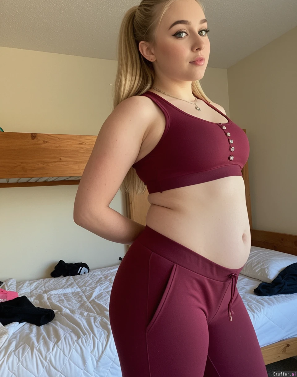 ((((Beautiful 21-year-old shorter college alt TikTok girl is standing in her dorm and getting dressed, she is breathing heavily, she is leaned back, Caucasian, slightly tanned, perfect gorgeous short freshman is gaining as much belly fat as possible, her face looks like Sabrina Carpenter)))), perfect lighting, (((wearing a perfect sports bra and burgundy athletic sweatpants, silver necklace, she must be completely clothed:1.6))), (((ultrarealistic))), (((perfect gorgeous youthful face, heavy alt e-girl makeup, thick eyeliner, perfect green eyes))), realistic, vibrant dark colors, very long fluffy blonde hair, ((((small button nose, high cheekbones, beauty, side view)))), (((she is shorter))), (((((she has a gorgeous 21-year-old Sabrina Carpenter face and a very chubby thick body with a fat-filled pot belly, her shirt must fully contain her rapidly expanding belly fat)))))