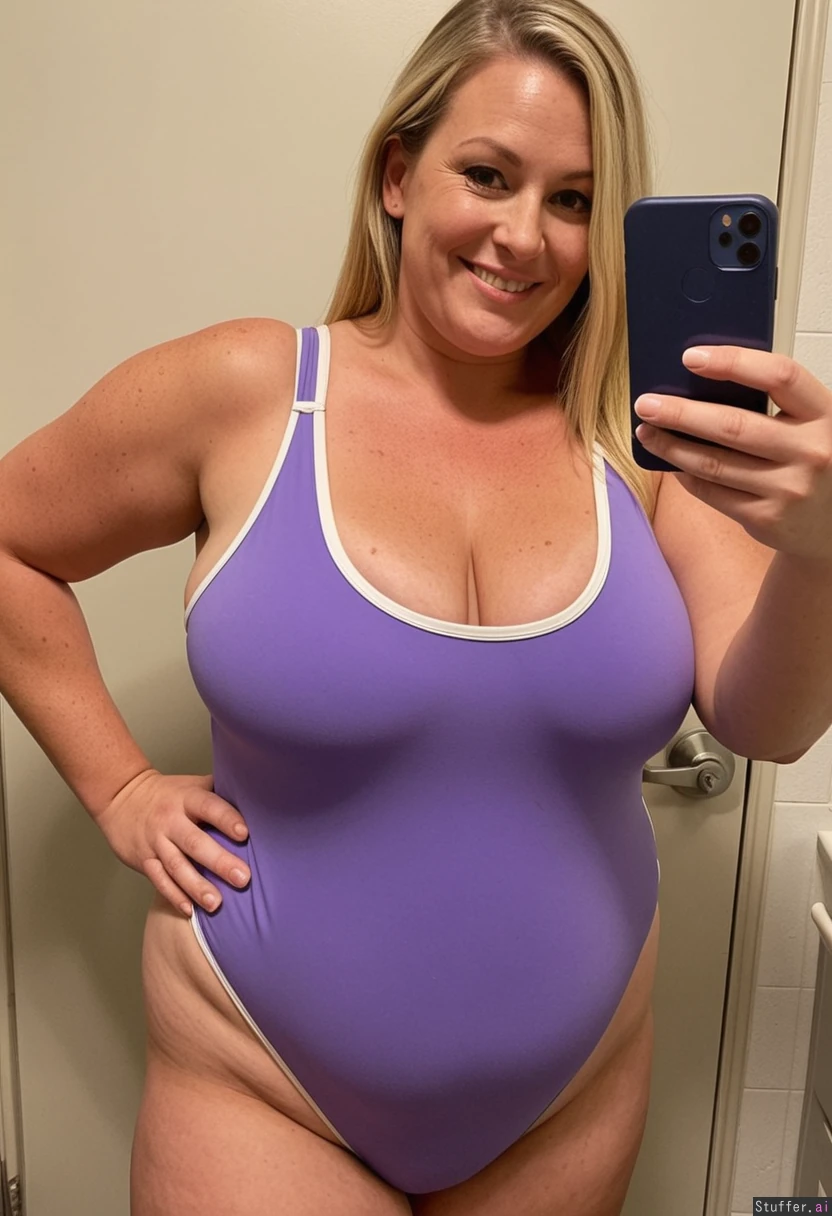 Huge fat Bbw milf, 40 years old, blonde, loose one-piece bathing suit, bathroom, selfie, smirk