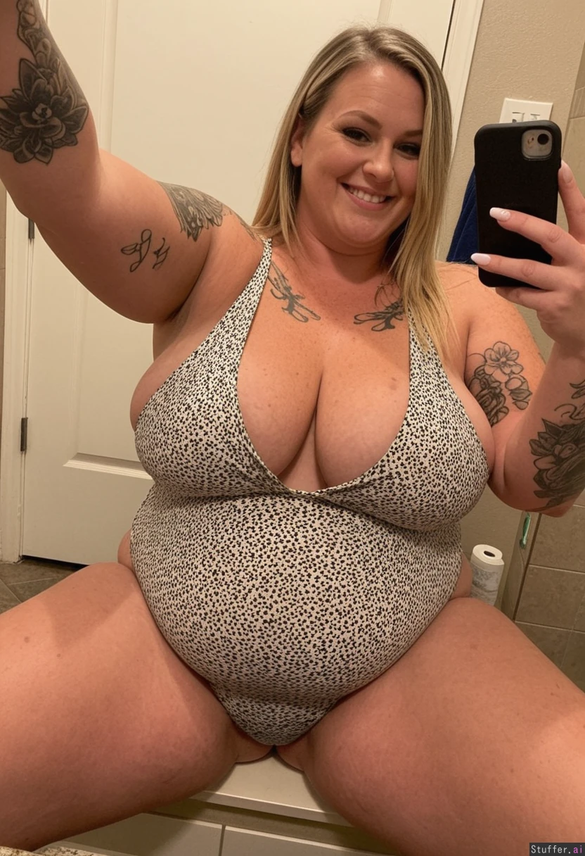 Huge fat Bbw milf, 40 years old, covered in tattoos, blonde, huge loose one-piece bathing suit, bathroom, selfie, smirk , sitting in bathroom counter