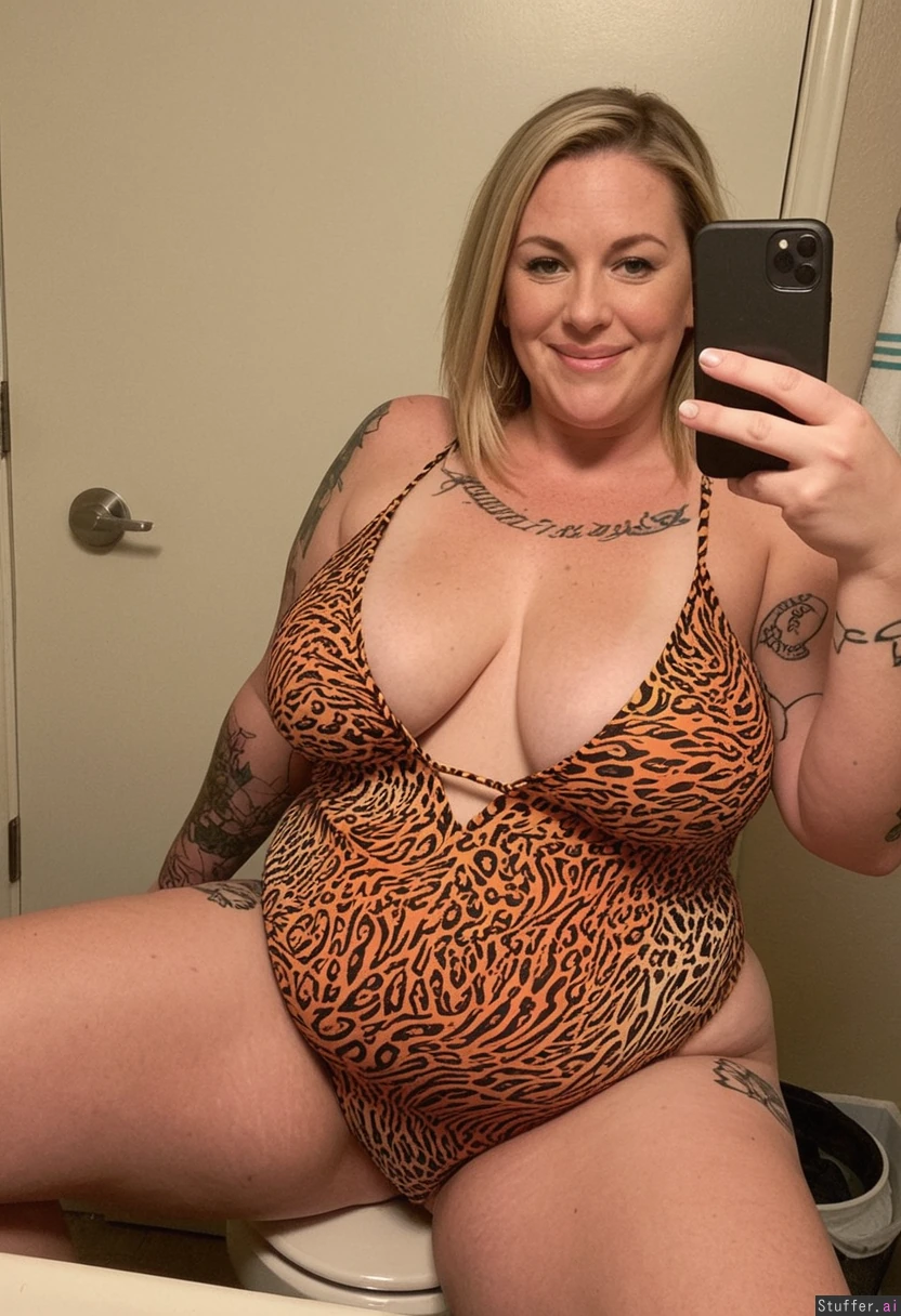 Huge fat Bbw milf, 40 years old, covered in tattoos, blonde, huge loose one-piece bathing suit, bathroom, selfie, smirk , sitting in bathroom counter