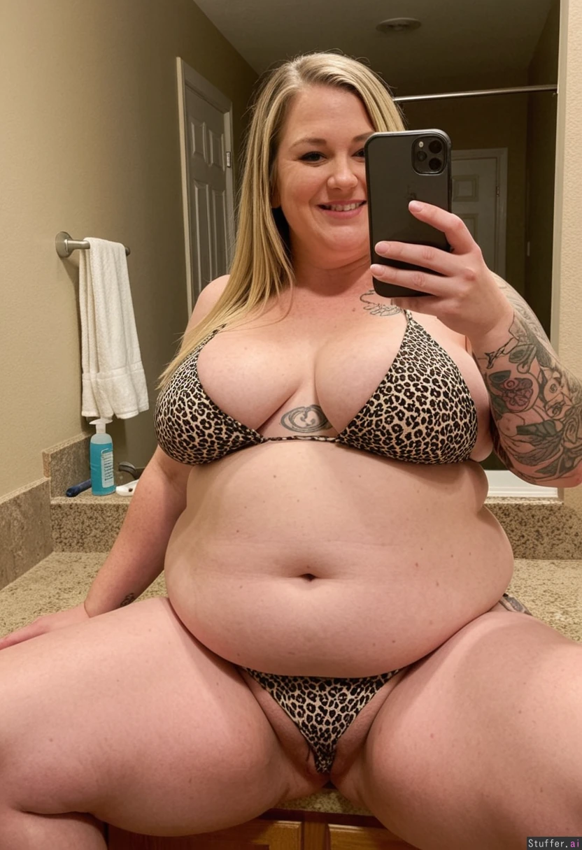 Huge fat Bbw milf, 40 years old, covered in tattoos, blonde, huge loose bikini, bathroom, selfie, smirk , sitting in bathroom counter, pulling panties to the side showing pussy