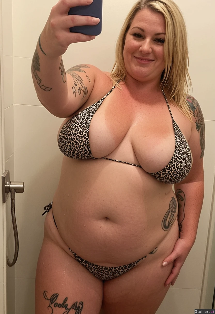 Huge fat Bbw milf, 40 years old, covered in tattoos, blonde, bikini, bathroom, selfie, smirk , in shower, soaking wet, pulling panties to the side showing pussy