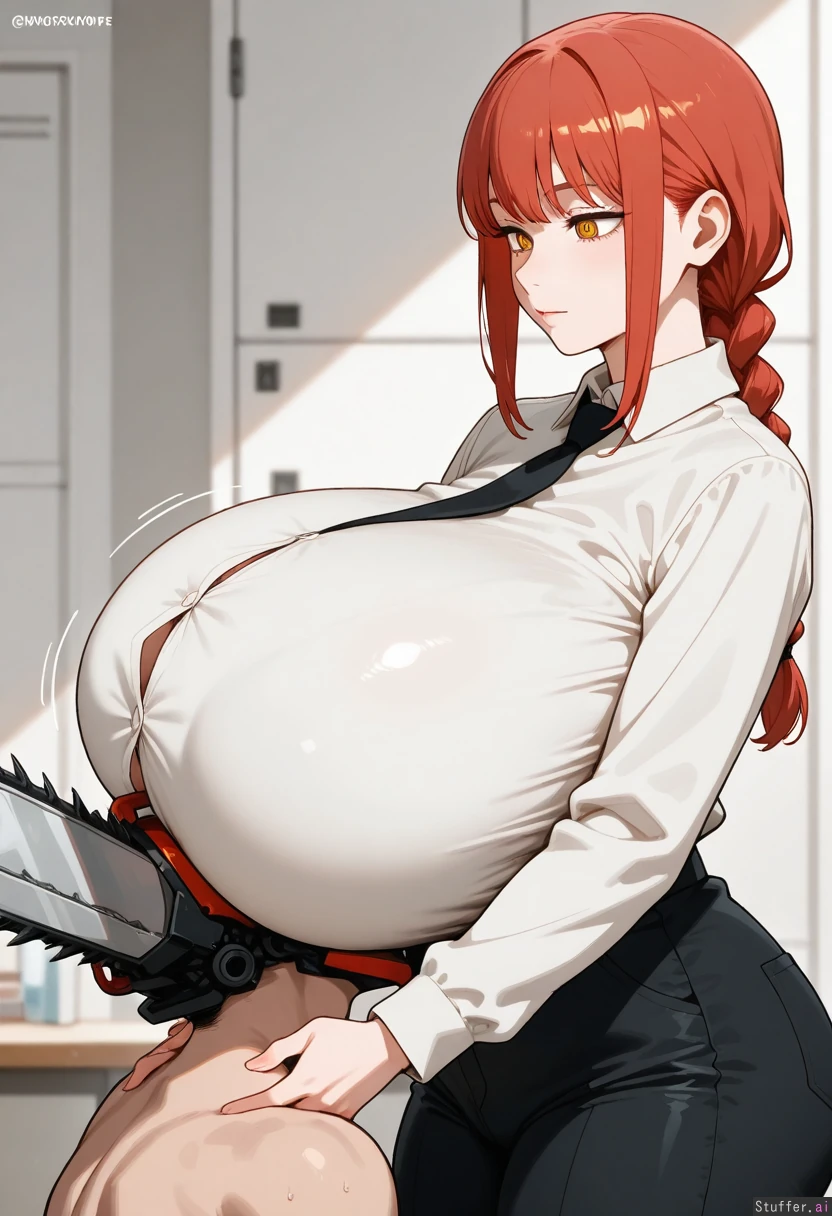 1girl, 1man, Makima_(Chainsaw_man), boobsmothering, gigantic boobs, overflowing,