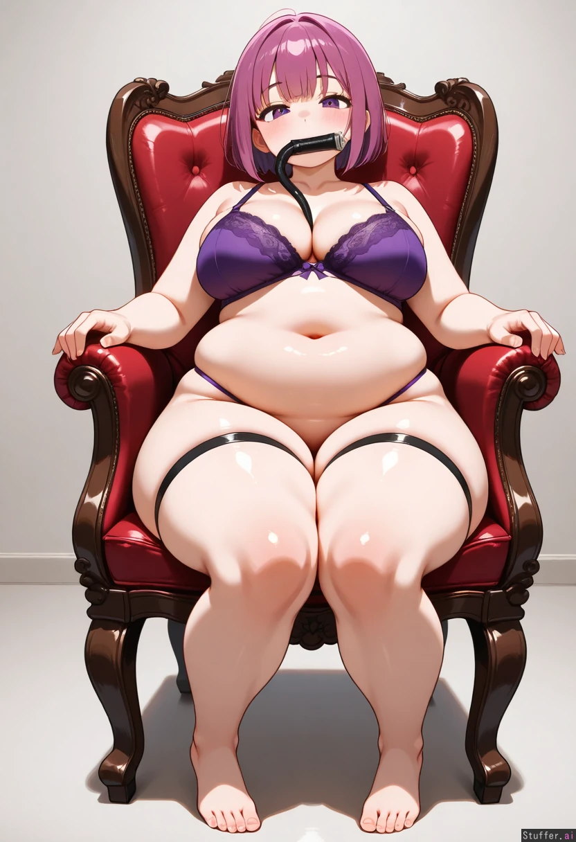 short pink and purple Bob cut hair, tight clothes, chubby belly, purple bra, thick thighs, forward view, , full body, no panties, sitting in chair, tube strapped to mouth, tube fed