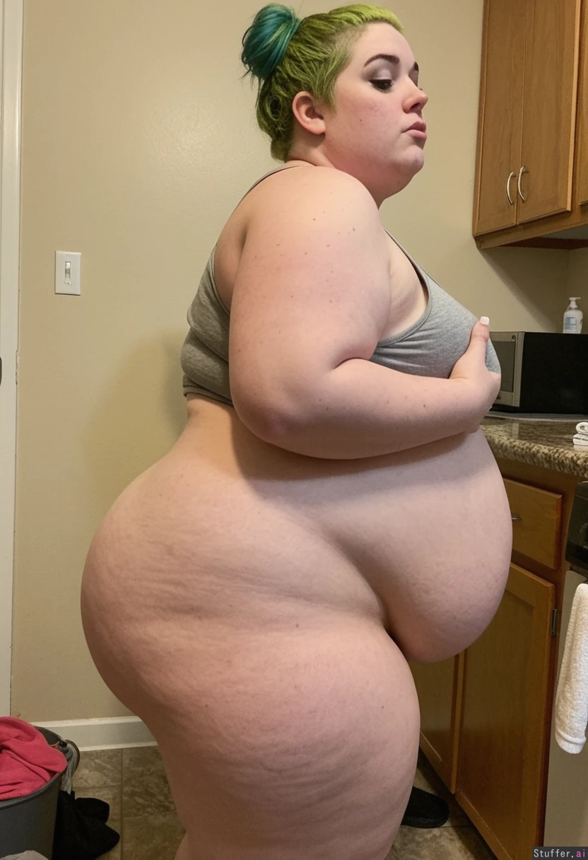 Real life low quality video of a short 300 pound morbidly obese feedee woman in her 20s. She is standing and leaning backwards in a messy apartment. Her extremely obese round belly is jutting out 3ft in front of her and hanging to her knees. She has green dyed alt hair. She has an Extremely obese face and blubbery double chin. Obese arms out to her sides. Wearing a tank top. Workout shorts. Winged eyeliner. Her hips are narrow, her bottom is extremely flat, and her legs are slender. Large lip fillers. SFW. 3 quarters side view.