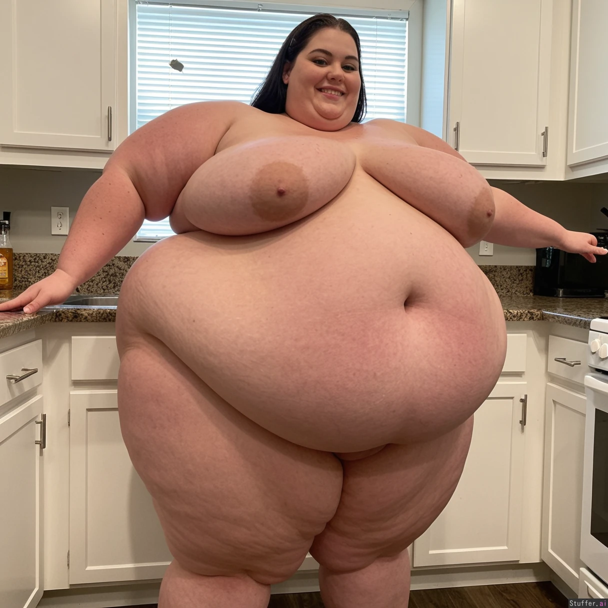 beautiful hyper obese ssbbw blob, shy smile, massive thick doughy thighs, cellulite, hyper massive wide thick saggy ass, assisted by fit woman to make her too fat to move, bulging love handles, tight fit enormous fat ass outgrowing luxury kitchen, massive wide thick saggy fat thighs, massive doughy fat arms, hyper morbid obesity