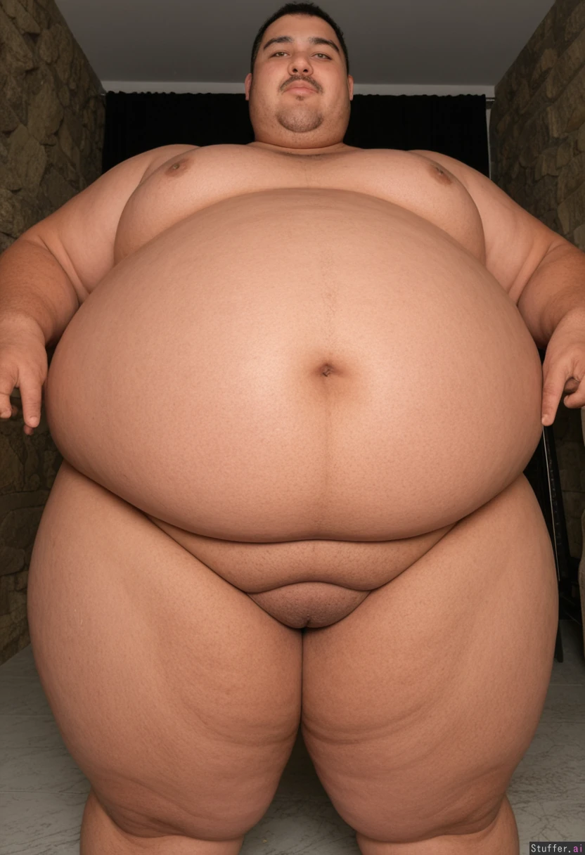 Mouvement of camera : (low angle) Style : Photorealistic, chiaroscuro torchlight, ultra-high resolution, 8K, HDR Inside a vast Levantine feast chamber lit only by braziers, the air thick with smoke and honey, blue silk banners sway above towering piles of pastries stacked to the ceiling. The wooden table is buried under mountains of clairs, fruit tarts, honey cakes, and overflowing jars of jam collapsing under their own weight, forming sticky pools across furs and polished stone. At the center, a breathtaking levantine boy stands nude except for her polished bronze sirik, his body slender and perfect, his breasts full and heavy, his hips gracefulyet all eclipsed by his ((((Enormous massive fat belly at least 9 feet in size:2.3)))), swollen, taut, glossy, trembling with the aftermath of unrestrained feasting. His skin is smeared with cream, honey, and broken fruit, his lips streaked with jam, his cheeks sticky and flushed. His skin is a dark chocolate-brown. he enters a state of feral trance, his movements slow and primal. For the entire shot, she performs one single action: with both hands, he presses and strokes his massive belly in wide, hungry circles, as if invoking a sacred hunger, his fingers sinking into layers of syrup and pastry debris coating his skin. he tilts his head back slightly, eyes half-closed, tongue passing over his jam-smeared lips with intoxicating anticipationno frenzy of eating yet, only the ritualized revival of hunger. Cream slides down the curve of his belly in thick rivulets as he caresses it, dropping in heavy globs onto the sea of pastries beneath him. his sirik trembles softly against his skin with each breath. The camera orbits tightly around his swollen dome from a low angle, firelight gleaming across syrup, honey, and crumbs stuck to every surfaceturning his into a living altar of messy, decadent desire.