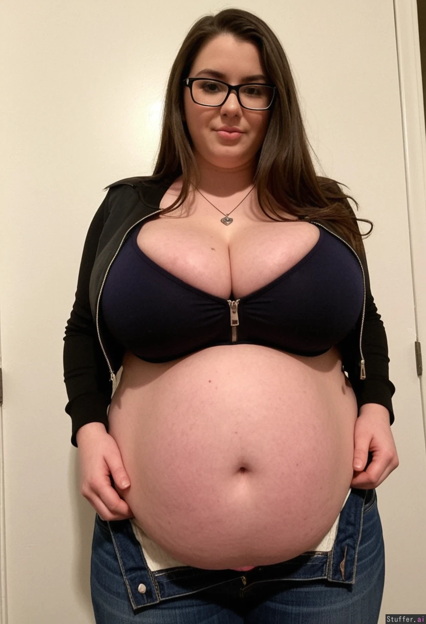 Huge boobs big tits lots of cleavage Brunette with long curvy hair, humongous beasts, super stuffed_belly, breasts_bigger_than_head, belly_bulge belly_bursting_out_of_clothes belly_blush belly bloat. Tight crop top, small crop top, unzipped jacket, jeans, wearing glasses and a necklace, large_navel navel_fetish, hands_behind_back, deep_navel
