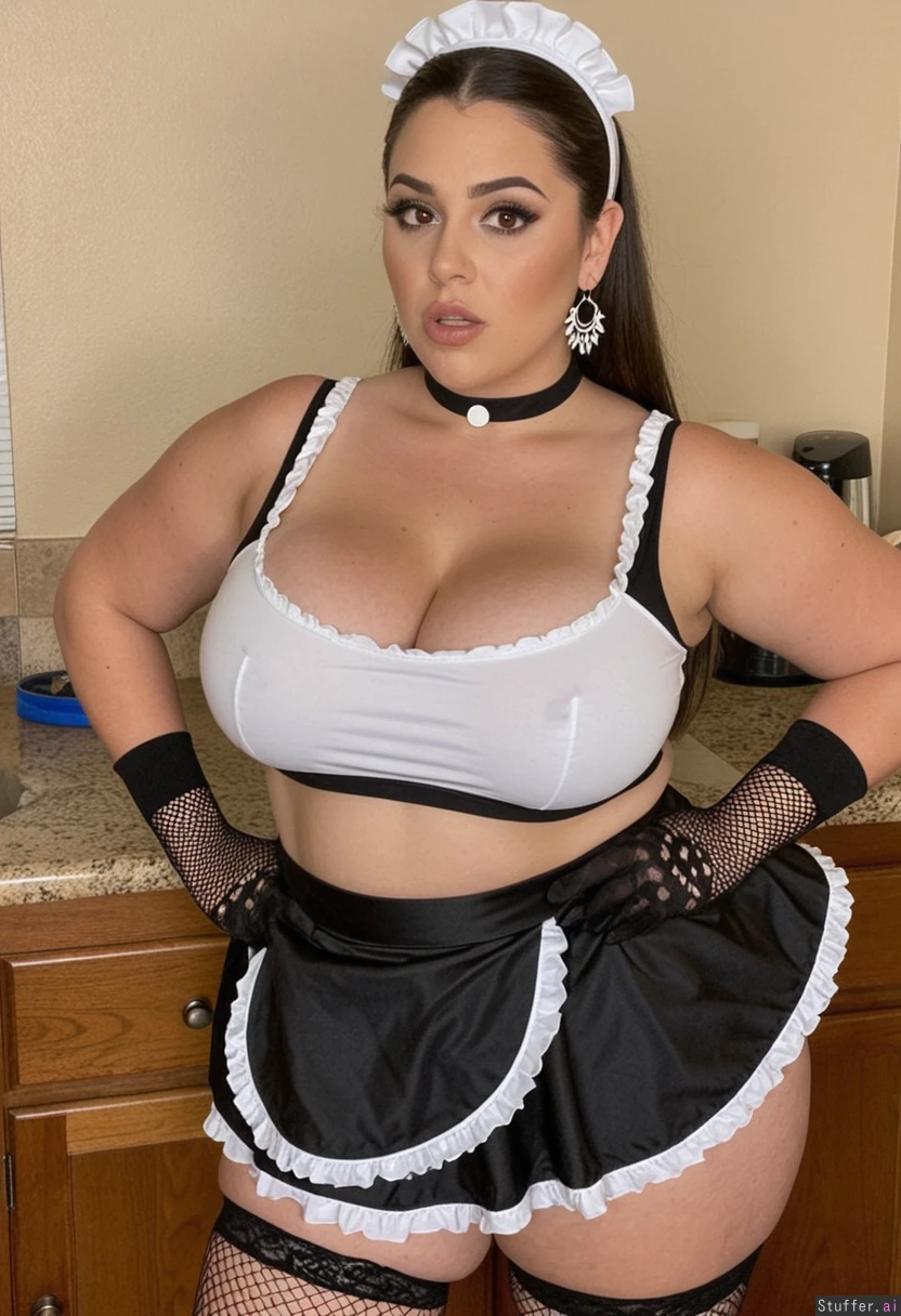 (1 woman), masterpiece, 8k, high resolution, beautiful face, detailed mouth, detailed eyes, large hips, brown eyes, dark brown hair, slightly chubby, plump, light skin, maid, sleeveless crop top, skirt, fishnet stockings, eyeliner, earrings, gloves, cleavage, standing