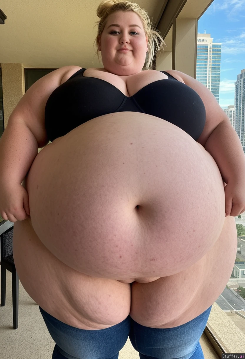 Gorgeous 20 year old, blonde hair in a messy bun, perfect small nose, freckles, ((Hyper-obese ssbbw:1.6)), ((hyper-enormous fat sagging belly, hyper-massive widest hips, and hyper-gigantic thick fat thighs:1.4)), ((wearing a covering fat huge bloated oversized adipose black bra and covering fat huge bloated oversized adipose high rise jeans, fully clothed)), Outdoor cafe, Close view, full body image