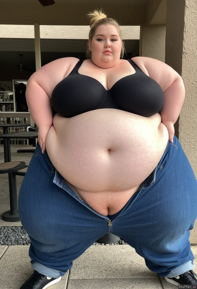 Gorgeous 20 year old, blonde hair in a messy bun, perfect small nose, freckles, ((Hyper-obese ssbbw:1.6)), ((hyper-enormous fat sagging belly, hyper-massive widest hips, and hyper-gigantic thick fat thighs:1.4)), ((wearing a covering fat huge bloated oversized adipose black bra and covering fat huge bloated oversized adipose jeans, fully clothed)), Outdoor cafe, Close view, full body image