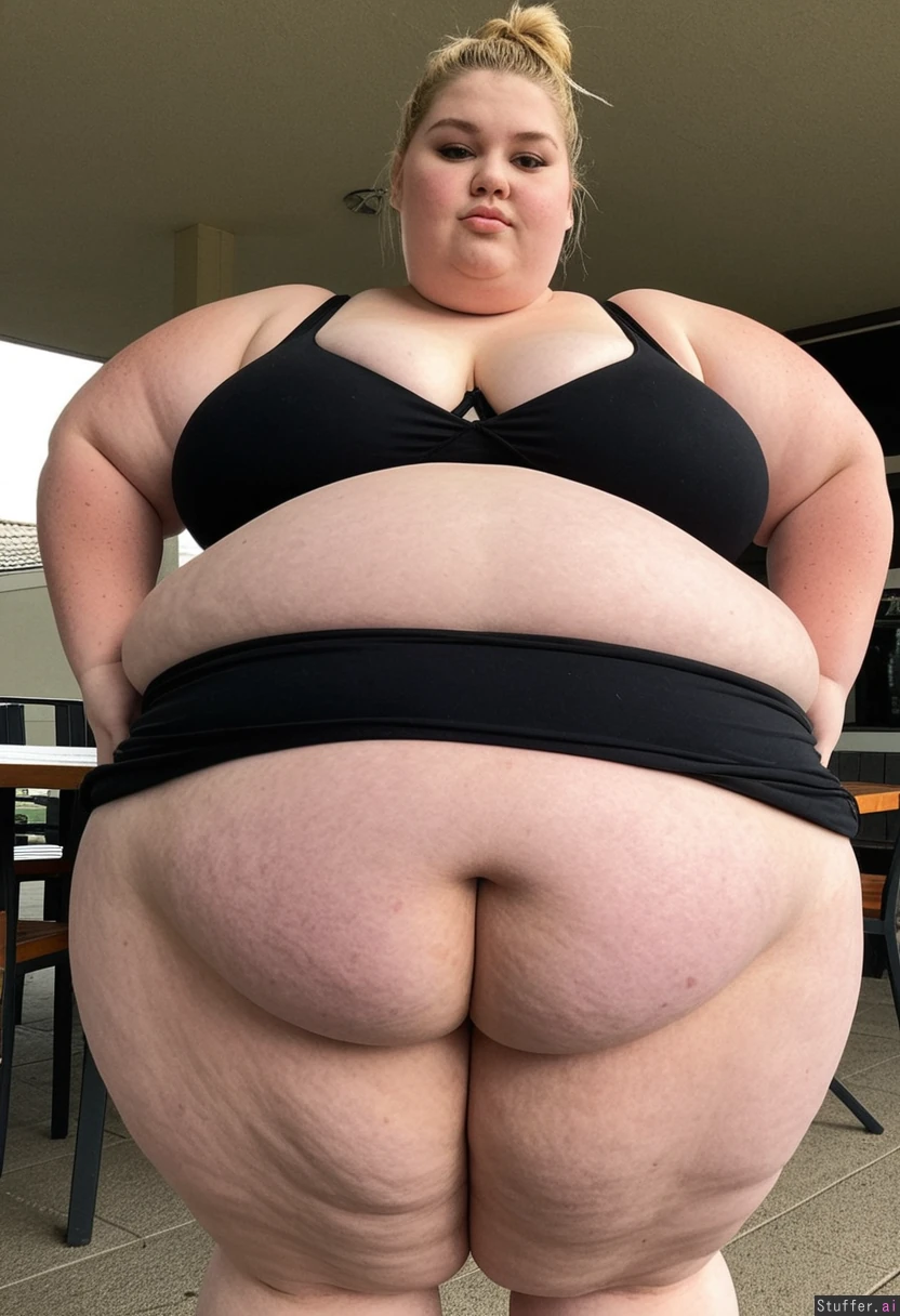 Gorgeous 20 year old, blonde hair in a messy bun, perfect small nose, freckles, ((Hyper-obese ssbbw:1.6)), ((hyper-enormous fat sagging belly, hyper-massive widest hips, and hyper-gigantic thick fat thighs:1.4)), ((wearing a covering fat huge bloated oversized adipose black bra and covering fat huge bloated oversized adipose mini skirt, fully clothed)), Outdoor cafe, Close view, full body image
