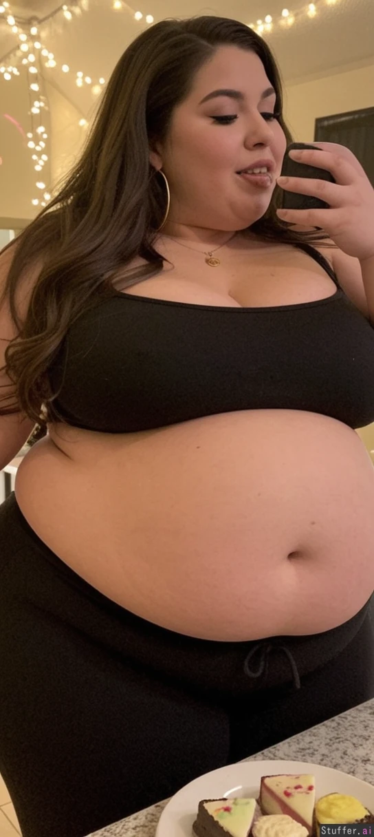 Extremely obese:2.0, Hyper obese, Massively obese:2.0, uSsbbw, 28yo, hot Latina, round-face, small-nose, soft-features, attractive, (sofia vergara face), symmetrical-face, loose-wavy-long-hair, college-coed, student, young-adult, ageless-beauty, (enormous heavy belly 2.0), massive belly makeup, eye-shadow, lipstick, blush, necklace, earrings, fashionable, Latina, alt soft smile, shy, wearing a tight crop top, sexy pants, exposed belly, belly out, side view, fat belly, fattened belly, fattened body, ssbbw, belly spilling out of pants plump, curvy, fertile, luscious, extremely obese, at-night, dimmed-lights, surrounded by desserts, belly bursting on to table as she eats sweets ((blurry-background, bokeh, portrait-mode,)) shot-on-iphone, smartphone-photography, candid, casual-pose, full body, deep navel, fat as fuck ((Extremely obese)) ((500lbs))