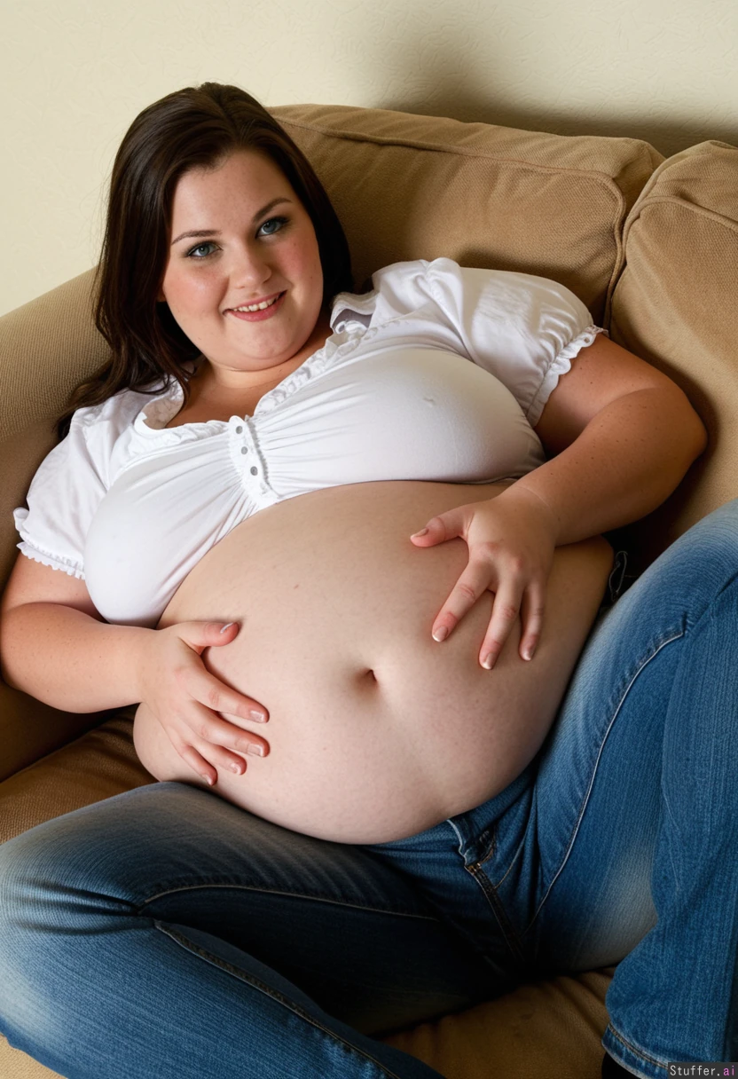 Beautiful brunette. Green eyes. High cheekbones. Enormously obese. Wearing blue jeans. White blouse. Blouse sleeves are stretched by her fat arms. Reclining on your sofa. Jeans pulled down to her knees. Top pulled up. Huge stuffed belly. Softly smiling. Hands wobbling belly.