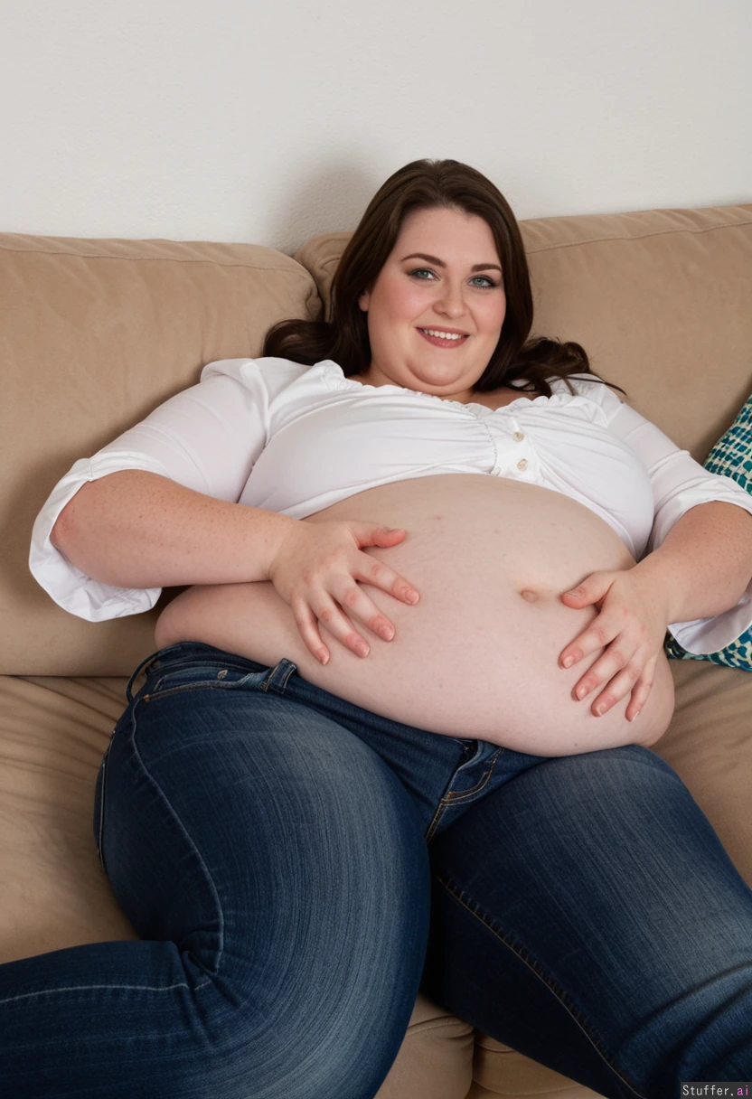 Beautiful brunette. Green eyes. High cheekbones. Enormously obese. Wearing blue jeans. White blouse. Blouse sleeves are stretched by her fat arms. Lying flat on your sofa. Jeans pulled down to her knees. Top pulled up. Huge stuffed belly. Softly smiling. Hands wobbling belly.