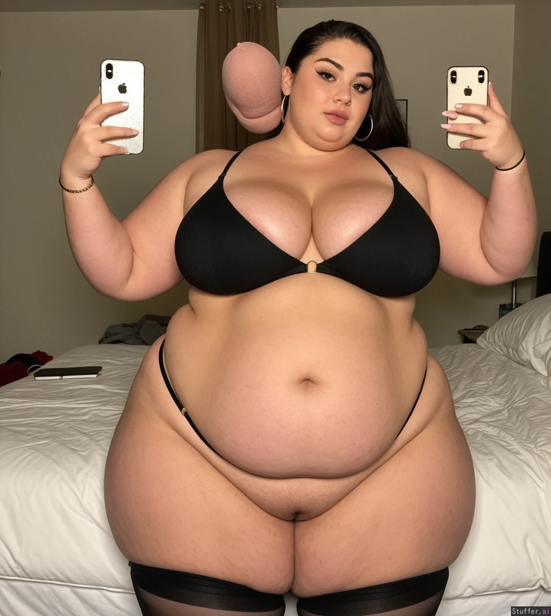 A unique natural attractive italian girl, model face, taking a mirror selfie, (((cleavage, stringkini, string panties, o ring bra, narrow waist, garter straps, thighhighs, plump fat belly))), supple detailed skin, ideal fuller figure, black eyeliner, hoop earrings, plump lips Style: instagram, social media, thirst_trap, sexy pose Lighting: Soft natural light Background: messy bedroom Camera Angle: full-body shot, slightly tilted for a selfie vibe, very soft belly (curvy:1.9)(hourglass:1.2)(heavy:1.9)(thicc:2.1)(bloated:1.8) (super tan skin: 1.5) (perfect beautiful face: 1.2) (bigger fatter wider voluptuous hip dips: 1.9) ((((extremely hyper obese fat girlfriend)))) (bigger fatter chubbier voluptuous thighs: 1.9)