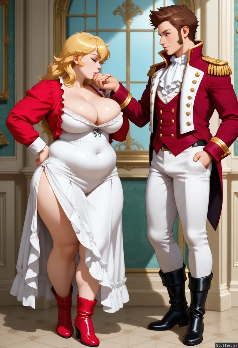 bbw , napoleon dress , versailles , , very big breasts , realistic , ankle boots , couple , gentleman , underwear , kissing_hand , futa **woman** (busty: 1.6) (plump: 1.4) (thicker: 1.5)