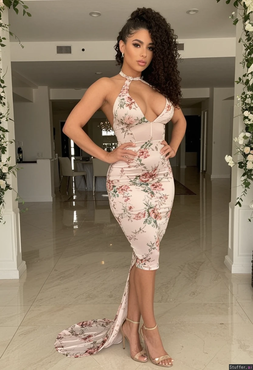 beautiful perfect latina with perfect hourglass body and heavy makeup and natural curly hair in a low ponytail. shes wearing a tight floral dress. she is at a beautiful wedding venue front view of full body