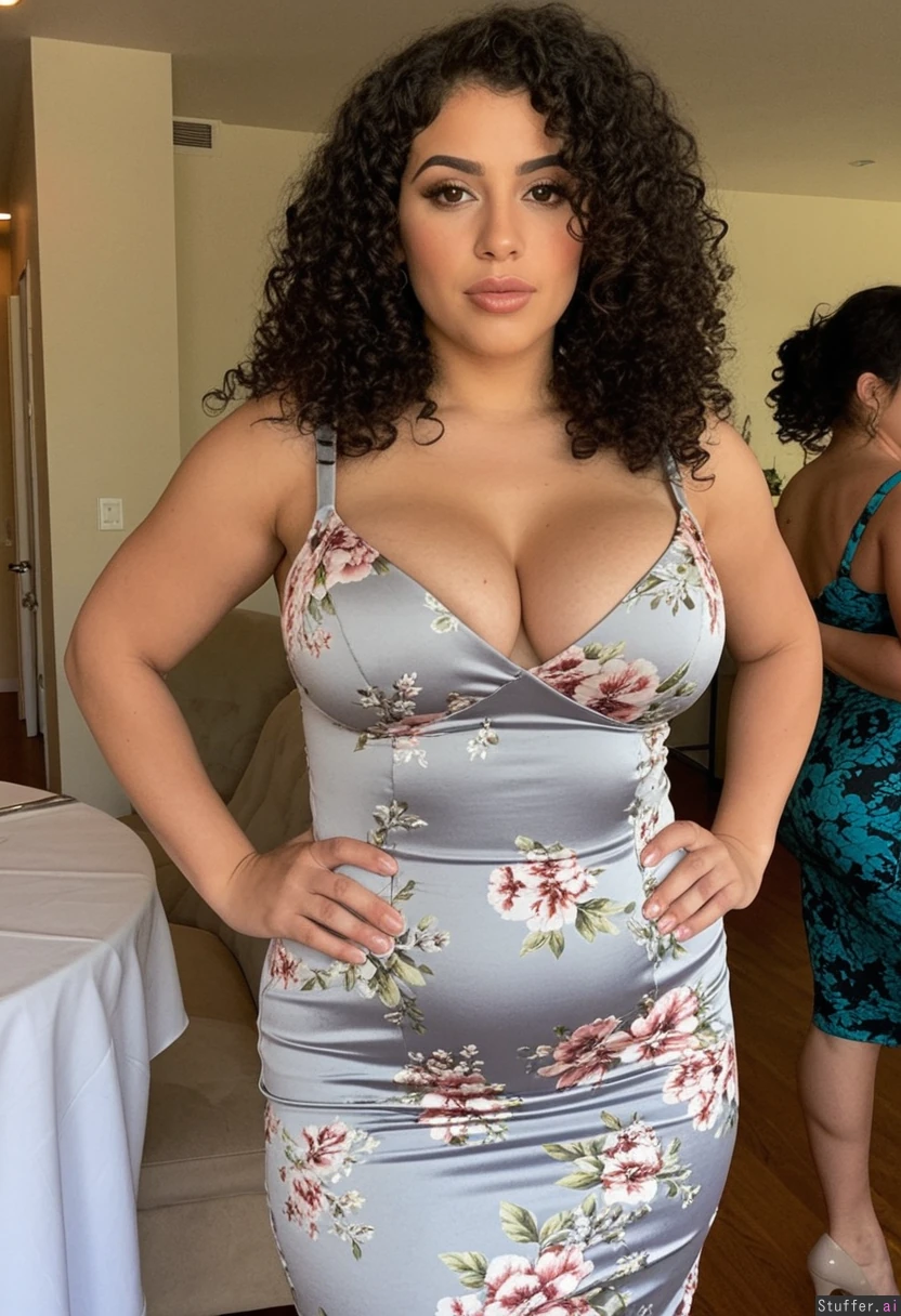 beautiful perfect latina with perfect hourglass body and heavy makeup and natural curly hair. shes wearing a tight floral dress. she is at a beautiful wedding venue front view of body (aging: 1.2) (body getting fatter: 1.1) (hair graying: 1.1)