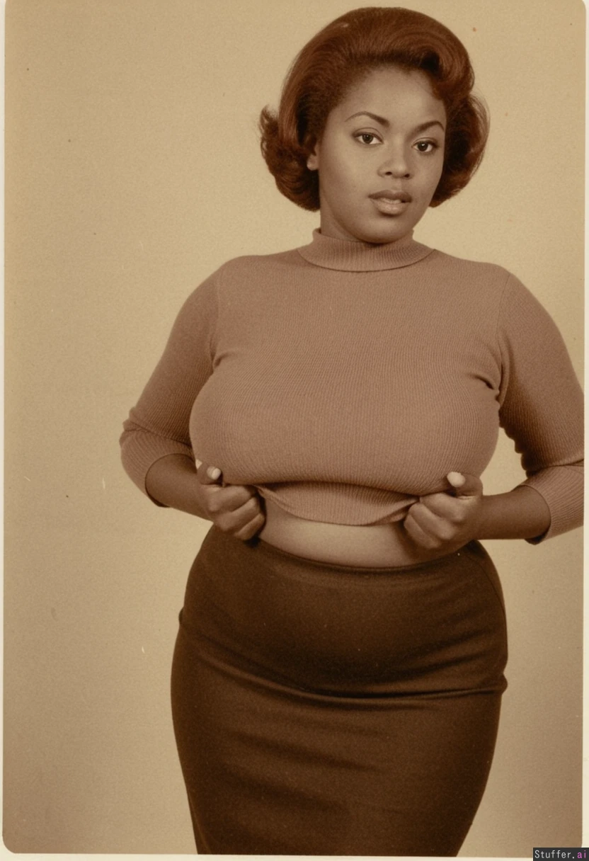 1950s, an attractive light brown african woman auburn hair in a tight sweater and skirt, (shes recently put on a lot of weight:1.4)