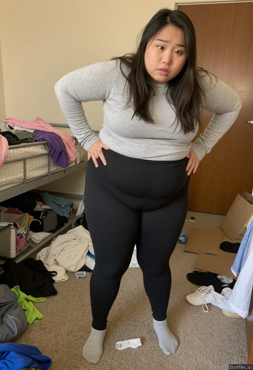 Wide candid shot of a messy dorm room. one fat asian girl struggles to fit into a pair of leggings. Pants pull. Trash and random mess on the floor. fat with dimpled skin, wearing a long sleeve shirt. standing. Perfect face and cute eyes.
