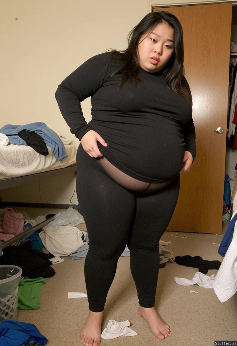 Wide candid shot of a messy dorm room. one ugly fat bloated blob asian girl struggles to fit into a pair of leggings. Pants pull. Trash and random mess on the floor. fat with dimpled skin, wearing a long sleeve shirt. standing. Perfect face and cute eyes.