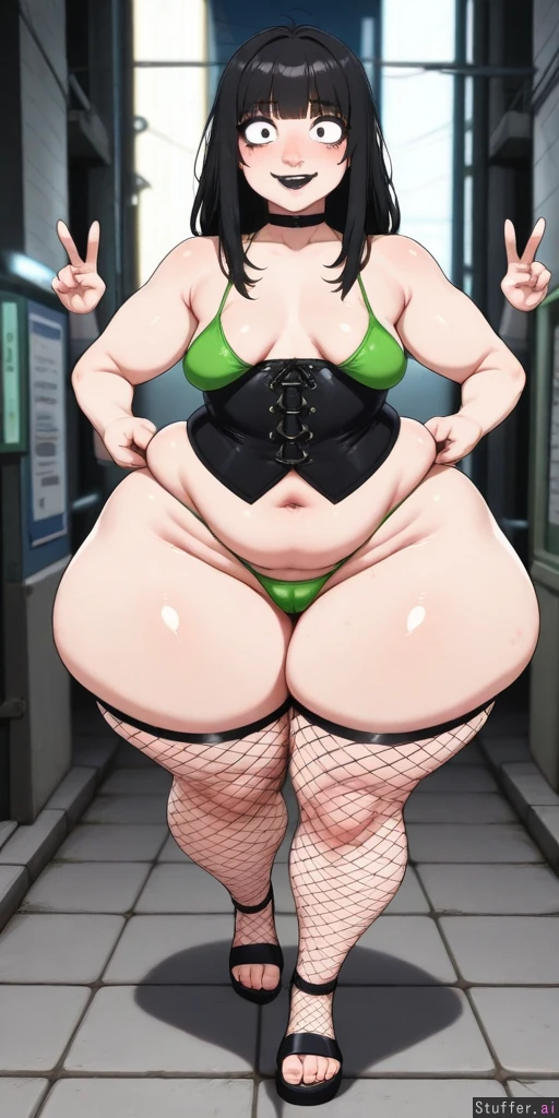 (((tall big booty white girl giving peace sign in downtown alleyway at night))), (((nighttime))), (((US urban))), fluorescent lightposts (((1girl))) (terrified), (((crying 1.6))), (((forced smile 1.6))), (((wide eyed terrified stare))) (((simple style 1.1)), (((flat colors 1.1))), (((simple flat render 1.1))), (((perfect anatomy 1.6))), (((perfect perspective 1.6))) perfect quality, flawless, masterpiece, auteur (((no text 1.6))) (((tall 1.6))), (((hyper detailed realistic face 1.6))), (((puffy lips))), full lips, (((plump lips))), full lips, (((thick messy black eyeliner))), (((running mascara 1.6))), (((black lipstick))), (strong nose bridge), (strong jawline), (elegant sexy face), strong cheekbones, (((beauty mark))) (((hyper bottom heavy 1.6))), (((obese))), (((ssbbw))), (((cellulite 1.6))), stretchmarks, (((hips wider than shoulders 1.9))), (((hyper narrow waist))), (((extremely wide hips 1.6))), (((huge meaty massive thighs 1.6))), ((( flared hips 1.6))), (((hip dips 1.6))), (((heavy sagging fat 1.6))), (((childbearing curvy hips 1.6))), (((huge heavy thighs))), (((sagging breasts))), veiny tits, (((massive sagging ass))), fat ankles, fat upper arms (((sagging hanging fat ass & thighs))), (((childbearing hips 1.6))), (fertility goddess) neon green bikini top, (((g string))), (((black corset))), (fishnet stockings), chunky pump sandals, choker, ((((clothes pinching))), (((bulging fat))) (((small flat stomach 1.9))) (((front view, facing viewer))), (((view from above 1.1)))