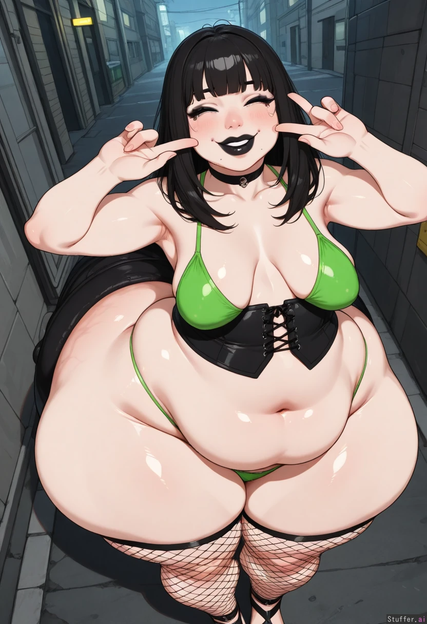 (((tall big booty white girl giving peace sign in downtown alleyway at night))), (((nighttime))), (((US urban))), fluorescent lightposts (((1girl))) (terrified), (((crying 1.1))), (((forced smile 1.1))), ((())) (((simple style 1.9)), (((flat colors 1.9))), (((simple render 1.9))), flat light, (((heavy line weight 1.6))), (((perfect anatomy 1.6))), (realistic anatomy 1.1) (((perfect perspective 1.6))) perfect quality, flawless, masterpiece, auteur (((no text 1.6))) (((tall 1.6))), (((hyper detailed realistic face 1.6))), (((puffy lips))), full lips, (((plump lips))), full lips, (((thick messy black eyeliner))), (((running mascara 1.6))), (((black lipstick))), (strong nose bridge), (strong jawline), (((elegant sexy face))), strong cheekbones, (((beauty mark))) (((hyper bottom heavy 1.6))), (((obese))), (((ssbbw))), (((cellulite 1.6))), stretchmarks, (((hips wider than shoulders 1.9))), flabby, chunky, dimpled fat, (((hyper narrow waist 1.6))), (((extremely wide hips 1.6))), (((huge meaty massive thighs 1.6))), ((( flared hips 1.6))), (((hip dips 1.6))), (((heavy sagging fat 1.6))), (((childbearing curvy hips 1.6))), (((huge heavy thighs))), (((sagging breasts))), veiny tits, (((massive sagging ass))), fat ankles, fat upper arms (((sagging hanging fat ass & thighs))), (((childbearing hips 1.6))), (fertility goddess) neon green bikini top, (((g string))), (((black corset))), (fishnet stockings), chunky pump sandals, choker, ((((clothes pinching))), (((bulging fat))) (((small flat stomach 1.9))) (((front view, facing viewer))), (((view from above 1.1)))