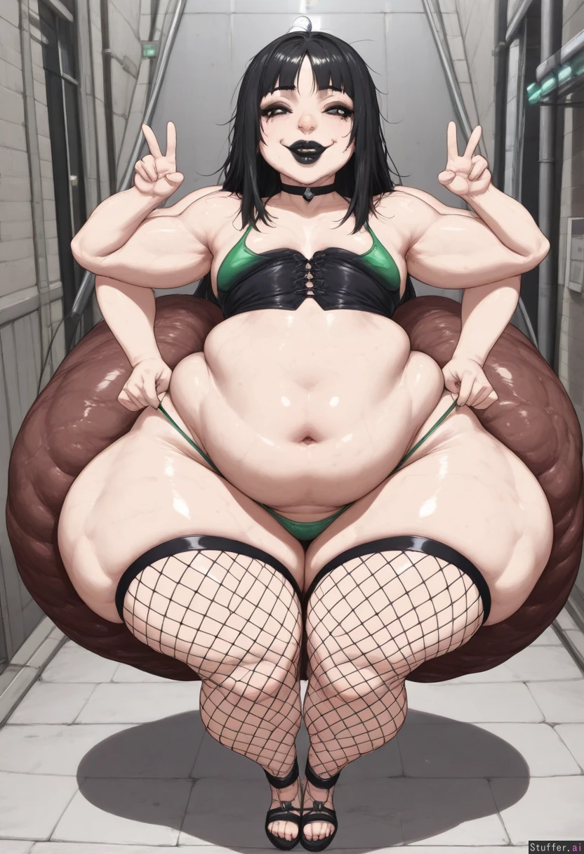 (((tall big booty white girl raver giving peace sign in downtown alleyway at night))), (((nighttime))), (((US urban))), fluorescent lightposts (((1girl))) (((terrified))), (((crying 1.1))), (((forced smile 1.1))), (((wide eyed fear)) (((simple style 1.9)), (((flat colors 1.9))), (((simple render 1.9))), flat light, (((heavy line weight 1.6))), (((perfect anatomy 1.6))), (realistic anatomy 1.1) (((perfect perspective 1.6))) perfect quality, flawless, masterpiece, auteur (((no text 1.6))) (((tall 1.6))), (((hyper detailed realistic face 1.6))), (((puffy lips))), full lips, (((plump lips))), full lips, (((thick messy black eyeliner))), (((running mascara 1.6))), (((black lipstick))), (strong nose bridge), (strong jawline), (((elegant sexy face))), strong cheekbones, (((beauty mark))) (((hyper bottom heavy 1.6))), (((obese))), (((ssbbw))), (((cellulite 1.6))), stretchmarks, (((hips wider than shoulders 1.9))), flabby, chunky, dimpled fat, (((hyper narrow waist 1.6))), (((extremely wide hips 1.6))), (((huge meaty massive thighs 1.6))), ((( flared hips 1.6))), (((hip dips 1.6))), (((heavy sagging fat 1.6))), (((childbearing curvy hips 1.6))), (((huge heavy thighs))), (((sagging breasts))), veiny tits, (((massive sagging ass))), fat ankles, fat upper arms (((sagging hanging fat ass & thighs))), (((childbearing hips 1.6))), (fertility goddess) neon green bikini top, (((g string))), (((black corset))), (fishnet stockings), chunky pump sandals, choker, ((((clothes pinching))), (((bulging fat))) (((small flat stomach 1.9))) (((front view, facing viewer))), (((view from above 1.1)))