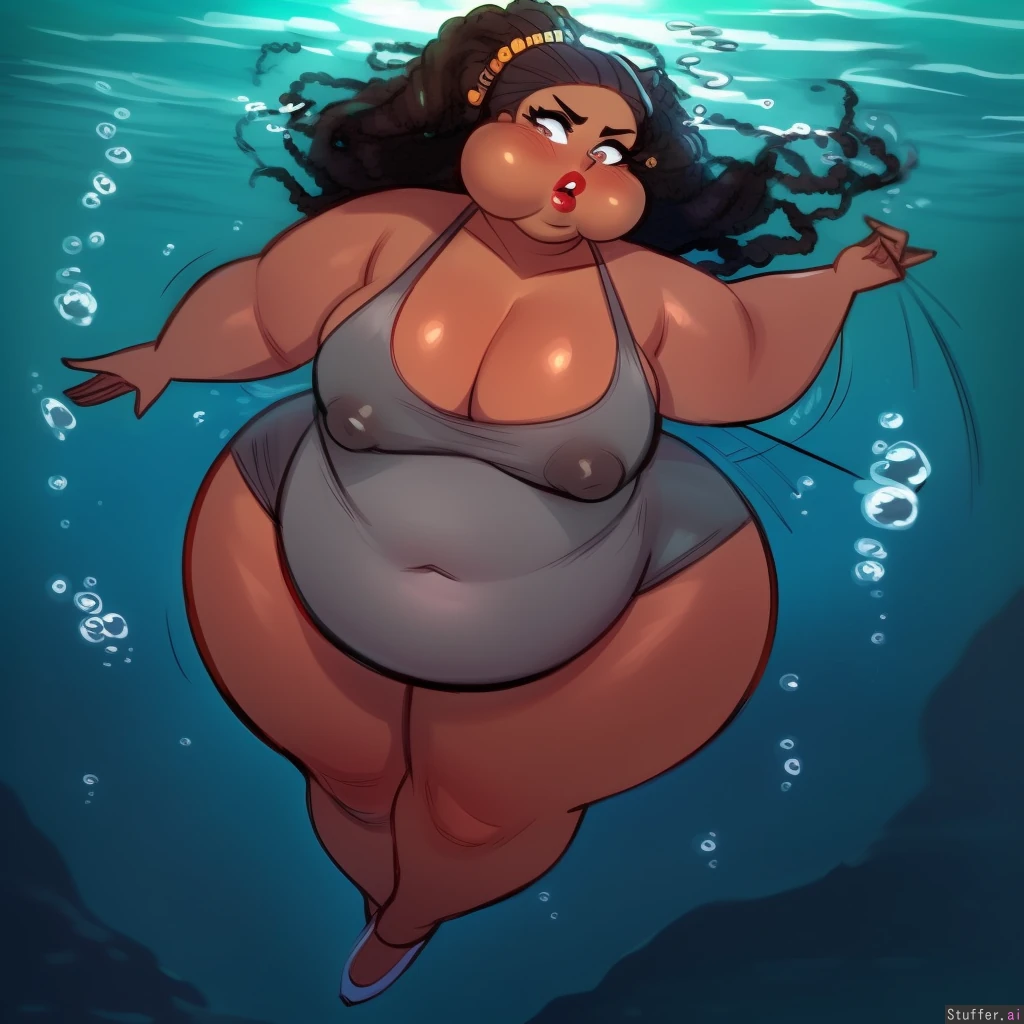 best quality, high rating, 1 african girl, (dark skin),(doja cat:1.5), c.cu(artist), spellsx(artist), midnitemorty(artist), long black_colored fro hair, dreads, pregnant bbw, ((leshawna total drama)), long eyelashes, chubby thighs, ((big butt:1.5)), (very wide hips), ((large voluptuous natural breasts)), bursting breasts, bloated, soft skin, tanned skin, curvy, chubby arms, very chubby face, adult, (large cleavage:1.5), blushyspicy(artist), worried look, (huge flabby belly), hanging belly, deep navel, (make-up:1.2), ((deep underwater, bouncing, floating midair, hair floating up, flailing)), ((looking_up)), (puckered_lips), (pouting), (drowning:2.1), (short neck), ((puffed cheeks:1.4)), (double chin:1.4), (blowing bubbles), ((gray onepiece swimsuit)), (leaky nipples), (big belly), (stretch marks on her belly), ((rear_view)), (moaning), (distress), (((struggling to float))), (worthless shaniqua thrown in the lake as punishment, forever sinking to the bottom), (angry being stuck underwater), (puckered lips), (((heavy black girl cannot swim)), she sinks deeper, negative buoyancy, going down, screaming underwater), pathetic, (big boned), (dense ebony body), (round blubbery girl sinking fast), (weighted belly, weighted ass, dragging her down), (thick red lips), (african woman drowning), (ghetto woman), (heavy as a boulder)