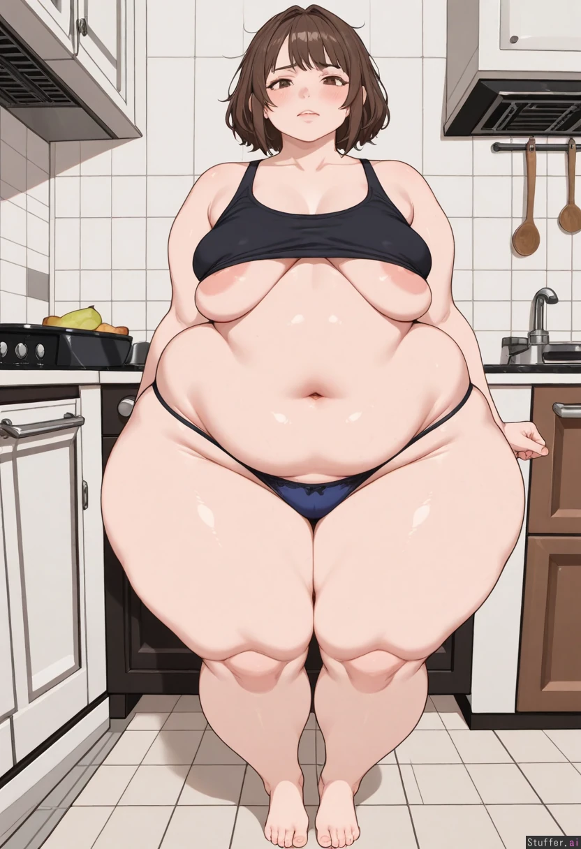 (((extremely bottom heavy big booty MILF rubbing tiny flat stomach in kitchen))) (helpless woman), (((embarrassed woman))), (annoyed), (exhausted), messy hair (((simple style))), (((flat colors))), uhd, 4k, (((perfect anatomy 1.6))), (((perfect perspective 1.6))) perfect quality, flawless, masterpiece, auteur (((no text 1.6))) (((plump round hyper detailed realistic face 1.6))), puffy lips, full lips, plump lips, full lips (((hyper bottom heavy 1.6))), (((pear shaped woman 1.9))), (((obese))), (((ssbbw))), (((extreme lipedema 1.7))), (((cellulite 1.6))), stretchmarks, (((hips 3x wider than shoulders 1.9))), (((hyper narrow waist))), (((extremely wide hips 1.6))), (((huge meaty massive thighs 1.6))), ((( flared hips 1.6))), (((hip dips 1.6))), (((heavy sagging fat 1.6))), (((childbearing curvy hips 1.6))), (((massive heavy thighs 1.9))), (((small sagging breasts))), veiny tits, (((massive sagging ass 1.9))), ( fat ankles) (((sagging hanging fat ass & thighs 1.9))), (((childbearing hips 1.6))), (fertility goddess), (((thick))), (((tank top))), (((panties))), barefoot, (((butt cleavage))), (((small flat stomach 1.9))) messy brown hair, (((hyper detailed lifelike face 1.6))) full body, standing up straight, (front view 1.6), high angle