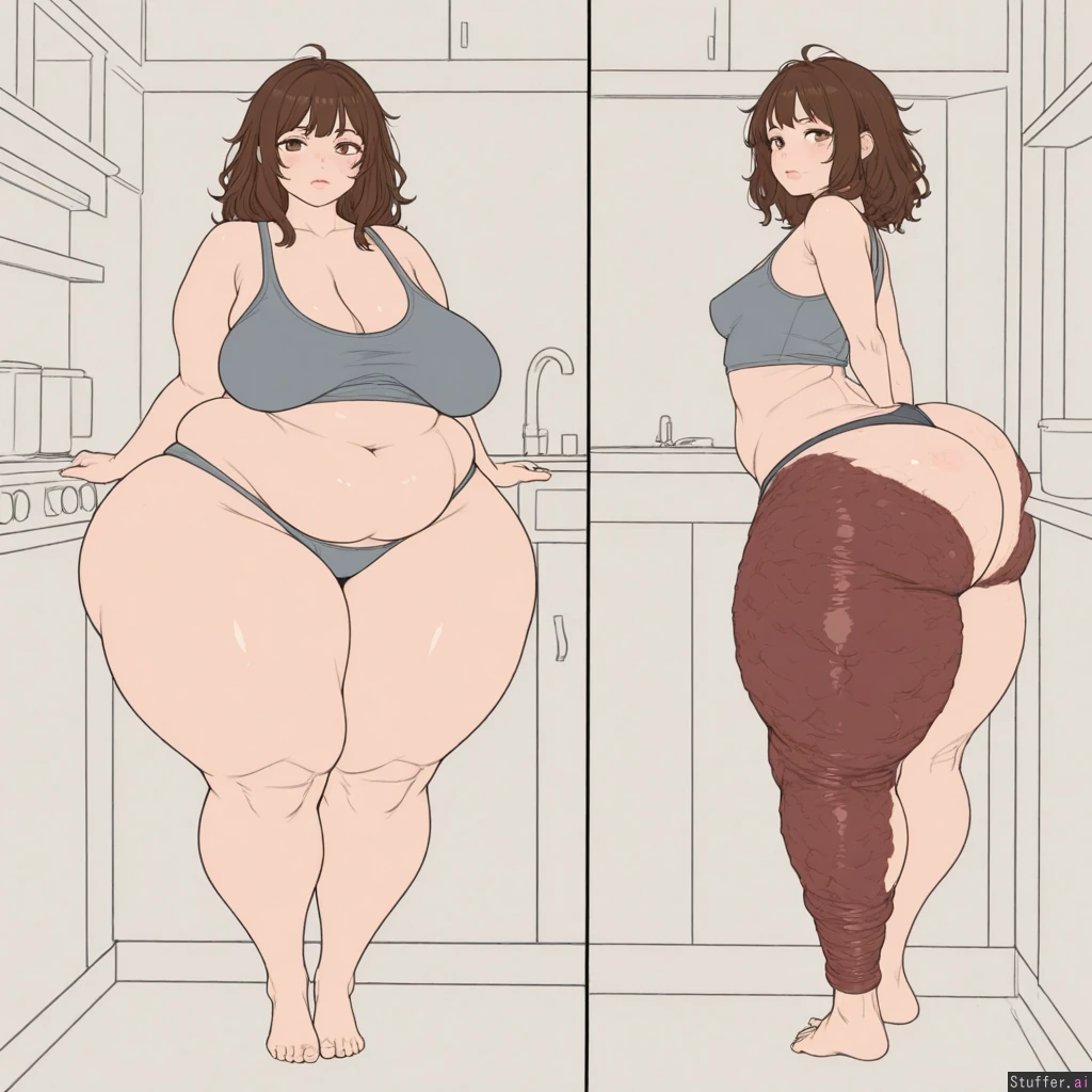 (((extremely bottom heavy big booty MILF rubbing tiny flat stomach in kitchen))) (helpless woman), (((embarrassed woman))), (annoyed), (exhausted), messy hair (((simple style))), (((flat colors))), uhd, 4k, (((perfect anatomy 1.6))), (((perfect perspective 1.6))) perfect quality, flawless, masterpiece, auteur (((no text 1.6))) (((plump round hyper detailed realistic face 1.6))), puffy lips, full lips, plump lips, full lips (((hyper bottom heavy 1.6))), ((( obese 1.9))), (((ssbbw 1.6))), (((extreme lipedema 1.7))), (((cellulite 1.6))), stretchmarks, (((hips 3x wider than shoulders 1.9))), (((hyper narrow waist))), (((extremely wide hips 1.6))), (((huge meaty massive thighs 1.6))), ((( flared hips 1.6))), (((hip dips 1.6))), (((heavy sagging fat 1.6))), (((childbearing curvy hips 1.6))), (((massive heavy thighs 1.9))), (((small sagging breasts))), veiny tits, (((massive sagging ass 1.9))), ( fat ankles) (((sagging hanging fat ass & thighs 1.9))), (((childbearing hips 1.6))), (fertility goddess), (((thick))), (((tank top))), (((panties))), barefoot, (((butt cleavage))), (((small flat stomach 1.9))) messy brown hair, (((hyper detailed lifelike face 1.6))) full body, standing up straight, (front view 1.6), high angle