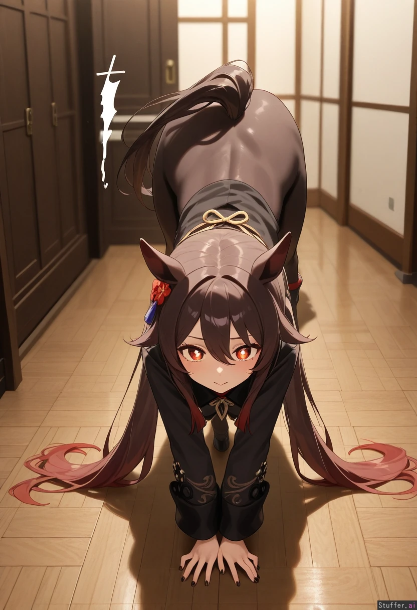Hu Tao from Genshin Impact, (Horse body:1.8), standing on all fours, full body