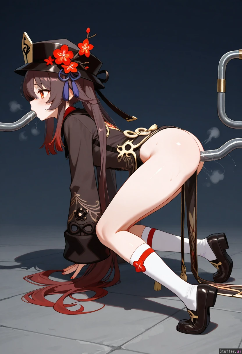 1woman, Hu Tao from Genshin Impact, standing on all fours, full body, side view, enormous black air tube up her butt