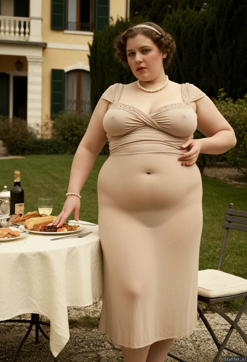 1920s Italy, A color image of a gorgeous young starlet with a prominent belly ((in a dress)), outside a villa, (fattened-up) by the constant overindulgence, standing at a table full of fattening food and strong drink, someone really needs a girdle, seductive despite her weight