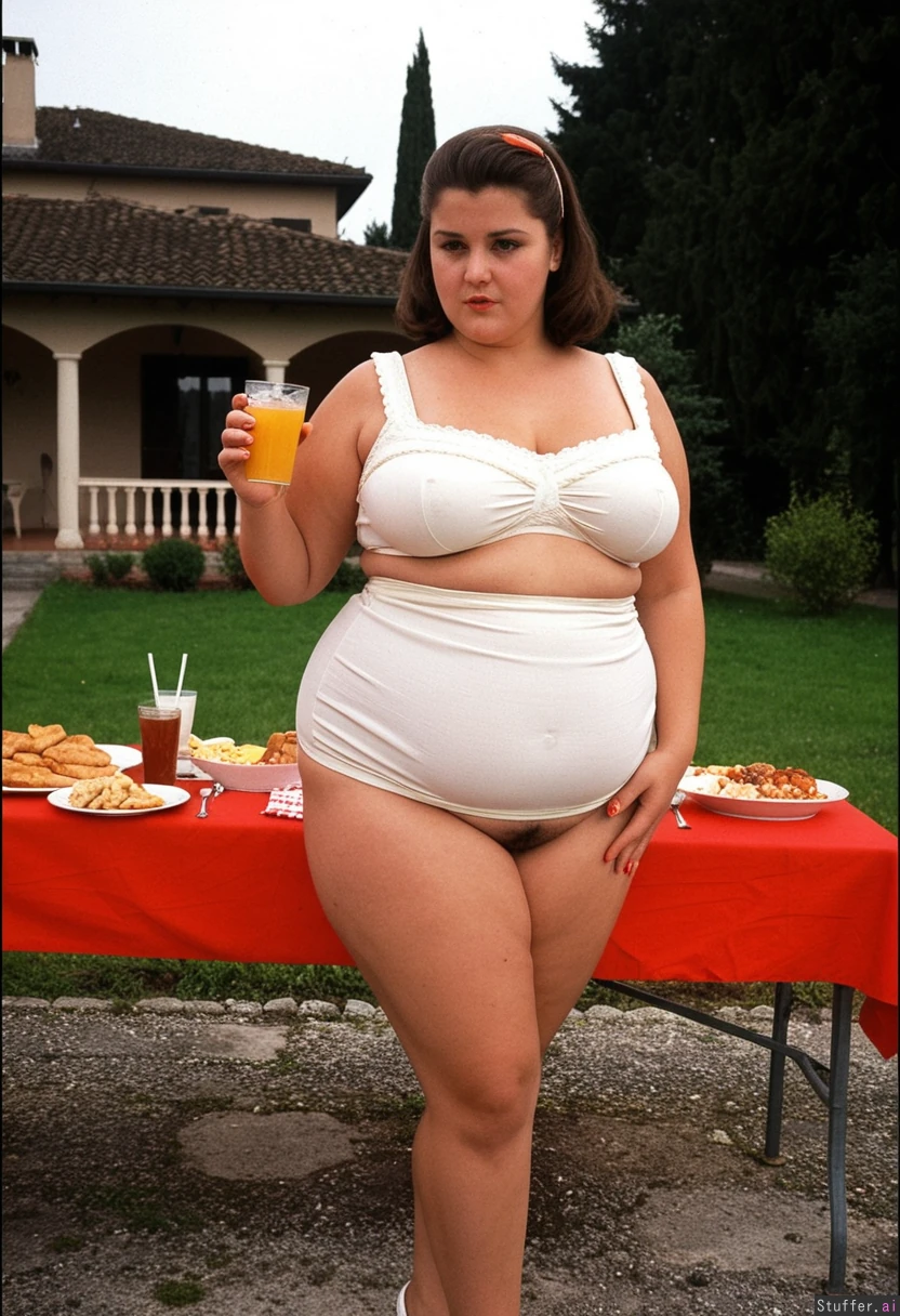 1960s, a gorgeous young Italian starlet with a prominent belly ((in a dress)), outside a villa, (fattened-up) by the constant overindulgence, standing at a table full of fattening food and strong drink, someone really needs a girdle, still quite seductive despite her ever-increasing weight