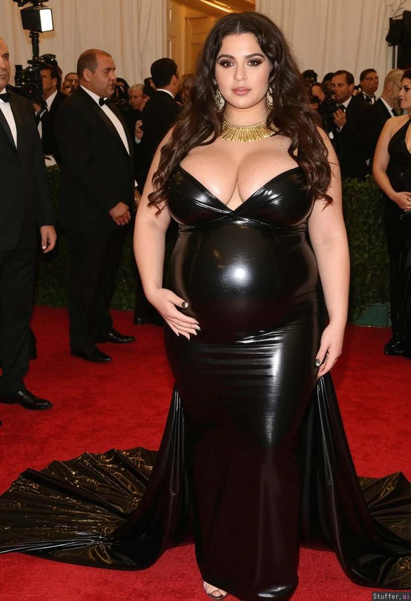 Pregnant Egyptian beautiful bimbo, plump lips, full makeup, massive cleavage, full body, latex dress , messy long hair, empty metgala